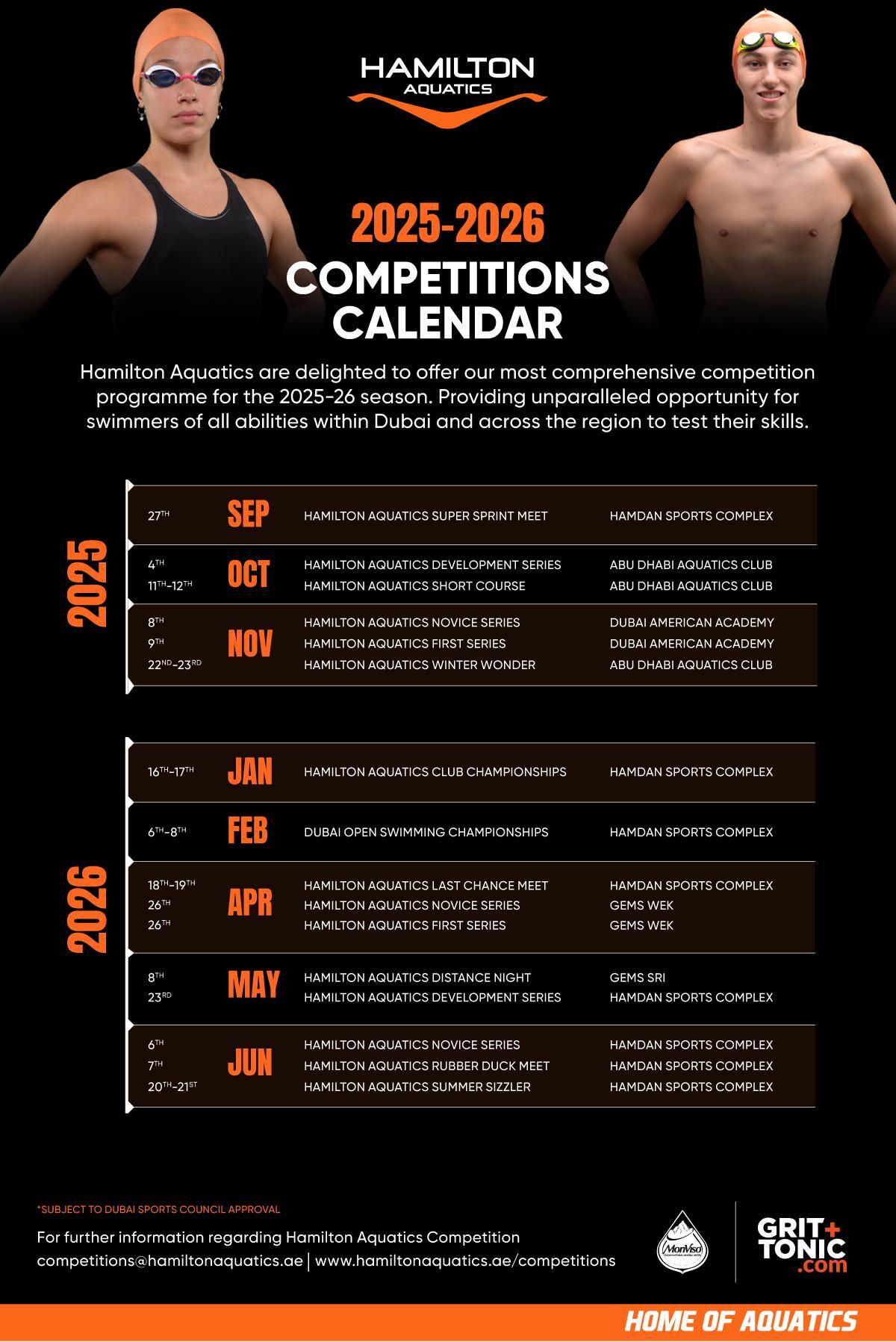 The Hamilton Aquatics Open Meets are aimed at swimmers with higher experience being used to competing regularly. There are short course (SC) and long course (LC) competitions, held over 2 days with morning and afternoon sessions, throughout the season. Hamilton Aquatics offers five Open Meets throughout the season, including the Dubai Open Swimming Championships previously known as the "Middle East Open and Junior Championships" in the month of February.